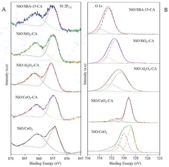 X-ray photoelectron spectroscopy (XPS) was used to investigate the nature and surface exposure of all the elements present in the developed catalysts. The oxidation states of Ni present on the support can be determined from the binding energy (BE) of Ni 2p3/2 XPS spectrum. As can be seen in Figure 3A, all the samples exhibited the Ni 2p3/2 BE between 855.2 and 855.7 eV along with the broad peak around 860.5 eV which are attributed to NiO species [38]. In case of the Ni/CeO2-CA, Ni/Al2O3-CA, Ni/SiO2-CA and Ni/SBA-15-CA catalysts, the main peak at 855.7 eV was slightly shifted to higher BE indicating that the nickel species might have strong interaction with the support. Figure 3B shows the XPS result of O 1s core electron levels for all the catalysts. The Ni/CeO2 catalyst exhibited the main peak at 529.1 eV with two shoulders at 530 eV and 531.1 eV implying the presence of different oxide species. The main peak appeared at 529.1 eV and the shoulder peak at 530 eV can be attributed to the lattice oxygen and weakly bonded oxygen species present in CeO2 [40]. The peak appearing at higher BE (531.1 eV) belongs to the surface absorbed oxygen. For the Ni/CeO2-CA sample similar observations indicate the combination of lattice oxygen and weakly bonded oxygen species and/or chemisorbed oxygen along with the shoulder peak (532.7 eV) corresponding to the adsorptive oxygen species present in this catalyst. The main peak appearing in the range between 530.5 eV and 532.2 eV for Ni/Al2O3-CA, Ni/SiO2-CA and Ni/SBA-15-CA samples could be attributed to adsorptive oxygen species, whereas the small peak at higher BE might be due the other oxygen species [39]. The presence of different oxygen species on all these supports due to their structure and chemical properties. The availability of high oxygen surface mobility by redox Ce4+/Ce3+ on CeO2 support could create more oxygen vacancies, which can enhance the catalytic reactions.