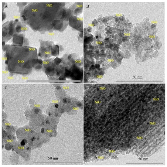 TEM images of (A) Ni/CeO2-CA, (B) Ni/Al2O3-CA (C) Ni/SiO2-CA and (D) Ni/SBA-15-CA catalysts.