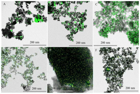 TEM-EELS images of (A) Ni/CeO2, (B) Ni/CeO2-CA, (C) Ni/Al2O3-CA, (D) Ni/SiO2-CA, (E) Ni/SBA-15-CA and (F) spent Ni/CeO2-CA catalysts.