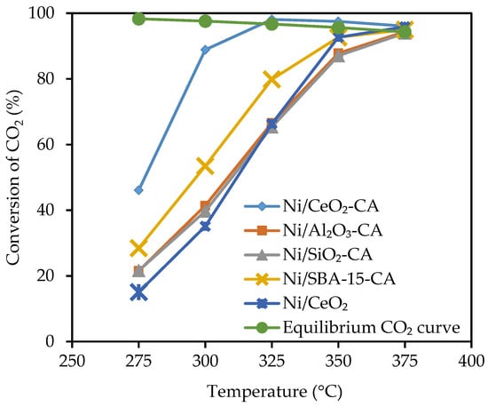Since the CO2 emissions into the atmosphere cause greenhouse effects and hence global warming, its fixation has received much attention in recent years and has become a world challenge and priority [1]. Hence, intensive efforts have been devoted to mitigating CO2 emissions through various strategies, such as CO2 capture and storage [2,3] and chemical recycling [4,5,6,7,8,9,10,11]. Indeed, many industries consider CO2 as a valuable resource rather than a waste [11,12,13]. However, it is necessary to find new paths enabling fuel production without releasing additional CO2 in the atmosphere. In recent years, increased research efforts have been dedicated to the chemical conversion of CO2 into useful chemicals such as methane, methanol, ethanol, and dimethyl ether through catalytic hydrogenation [14]. However, CO2 methanation is considered to be one of the most promising ways of transforming CO2 into methane, which is an important chemical feedstock as well as a fuel for power generation by gas turbines. However, the reaction temperature needs to be controlled since the exothermic character of methanation reaction makes the temperature control of methanation reactors difficult, especially under conditions of dynamic operation [15]. Plate heat-exchanger reactors offer benefits here of improved temperature control [16]. However, the amount of catalyst which can be incorporated into such a reactor is limited. Therefore, the development of catalysts of high activity is the key factor for the CO2 methanation reaction at low temperature [17,18].