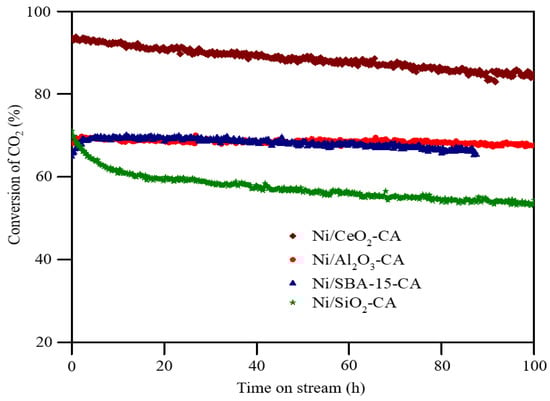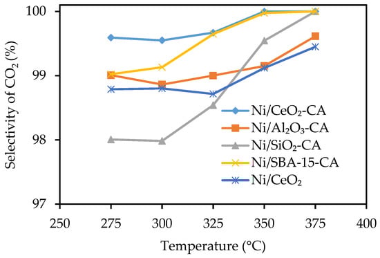 The effect of chelating ligand and different supports on the performance of the developed Ni-based catalysts was investigated for CO2 methanation. The catalytic activity was tested under different reaction temperature on the catalytic conversion of CO2 over Ni/CeO2, Ni/CeO2-CA, Ni/Al2O3-CA, Ni/SiO2-CA and Ni/SBA-15-CA catalyst between 275 °C and 375 °C. All the catalysts were reduced with H2 gas at 450 °C prior to the CO2 methanation tests. Figure 6 displays the percentage of CO2 conversion against the reaction temperature for all the catalysts. It can be seen that the CO2 conversion increases with the reaction temperature gradually then reached a maximum value, except for the Ni/CeO2-CA catalyst. It is worth mentioning that owing to thermodynamic limitations, no significant increase of the conversion could be observed above 375 °C with a maximal CO2 conversion of 96.3% for all the catalysts. Methane was determined to be a major product for all the catalysts. In addition to methane, small quantities of carbon monoxide were also detected especially at low temperatures. Among all the tested catalysts, the Ni/CeO2-CA catalyst exhibited the best CO2 conversion of maximum 98.6% already at 325 °C when compared with the other catalysts. A further raise in temperature led to a slight decrease in CO2 conversion due to the exothermicity of methanation reaction. Since the high temperature has a negative effect on CO2 methanation reaction, 325 °C could be the optimum temperature to achieve maximum CO2 conversion and high selectivity towards CH4 for this catalyst under the conditions of this test. The Ni/CeO2-CA catalyst yields highest CO2 conversion of all samples at a low reaction temperature of 325 °C [34]. Among the catalysts investigated, the citric acid addition in Ni/CeO2 catalyst preparation showed substantial improvement of the catalytic performance compared to the Ni/CeO2 catalyst prepared without addition of CA. Apparently, the Ni/CeO2-CA catalyst exhibited much higher CO2 conversion than Ni/CeO2. As confirmed by the TEM results (Figure 4), the Ni dispersion could be the critical factor to control the catalytic activity in these Ni catalysts. It implied that the addition of chelating ligand enhanced the dispersion of Ni species and control the particle size, resulting in more exposed active species, which was responsible for the superior catalytic activity [41]. The carboxylic groups of CA could deprotonate easily and generate the citrate ligands, which are capable of coordinating with nickel ions and prevents the aggregation of large-size Ni nanoparticles during the calcination process. Suárez-Toriello et al. [40] reported that the addition of CA drastically changed the chemical equilibria in the solution mixture and the deprotonation of the carboxylic acids groups increased the amount of citrate ligands, which is capable of forming Ni–citrate complexes. The catalytic performance of all the catalysts studied at different reaction temperatures is in the following order: Ni/CeO2-CA > Ni/SBA-15-CA > Ni/Al2O3-CA > Ni/SiO2-CA > Ni/CeO2. As shown in Figure 6, ceria-supported Ni catalyst prepared by the CA modified method showed higher CO2 conversion than Al2O3, SiO2, and SBA-15-supported Ni catalysts. The higher catalytic activity of Ni/CeO2-CA is associated with the medium basicity of CeO2 support, compared to other supports used in this work, allowing stronger CO2 adsorption. The adsorbed CO2 on CeO2 support can be reduced easily due to the sufficient amount of oxygen vacancies available on the CeO2 support. Pan et al. [36] reported that Ce0.5Zr0.5O2-supported Ni catalyst is highly active when compared with Ni/γ-Al2O3. Similarly, Tada et al. [29] investigated the catalytic performance of different supported Ni catalysts on CO2 methanation and reported that the partial reduction of the CeO2 surface, which was covered by CO2-derived species are responsible to yield higher CO2 conversion over Ni/CeO2 compared with Ni/γ-Al2O3, Ni/TiO2, and Ni/MgO. When compared with other supports the unique superiority of CeO2 is that the existence of Ce3+/Ce4+ ion pairs on its surface can enhance the formation of the oxygen vacancies, which can promote the adsorption and activation of CO2 [32,55]. The SBA-15-supported Ni catalyst with highest surface area of 380 m2/g showed however lower activity than Ni/CeO2-CA with a lower surface area of 44 m2/g, indicating that the surface area of the developed catalyst has no significant effect on the catalytic activity. As seen in Figure 7, all the developed catalysts show high selectivity towards methane in the temperature range of 275−375 °C. Compared with Ni/CeO2, Ni/CeO2-CA exhibits higher selectivity towards methane. The maximum selectivity of methane was found to be 99.7% for Ni/CeO2-CA.