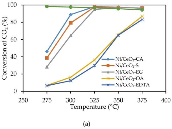 To investigate the influence of chelating ligands on catalytic performance, the methanation reaction was performed over Ni/CeO2 catalysts prepared by using various chelating ligands such as sucrose (S), EG, OA, and EDTA and the obtained results are shown in Figure 8. The CO2 conversion for Ni/CeO2-S and Ni/CeO2-EG increased with increasing reaction temperature up to 325 °C and remained then stable close to complete conversion with further increasing reaction temperature. The selectivity towards methane is very close to 100% for these catalysts at all reaction temperatures (Figure 8). Notably, the conversion of CO2 and selectivity of methane was initially much lower and increased then with increasing reaction temperature for the Ni/CeO2-OA and Ni/CeO2-EDTA catalysts. Among the catalysts tested, Ni/CeO2-S and Ni/CeO2-EG exhibited much higher CO2 conversions around 97.5% and 94.8%, respectively, at 325 °C. However, the CO2 conversion obtained for these catalysts was slightly lower than for the Ni/CeO2-CA (Figure 6). Ni/CeO2-OA and Ni/CeO2-EDTA catalysts showed poorer catalytic activity under the same conditions, indicating that the nature of chelating ligands had affected the dispersion of Ni species on the support which was confirmed by TEM measurement (Figure S2).