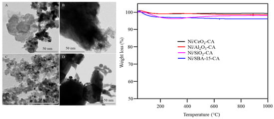 TEM images of different spent (A) Ni/CeO2-CA, (B) Ni/Al2O3-CA (C) Ni/SiO2-CA and (D) Ni/SBA-15-CA catalysts (left) and TGA results of different spent catalysts (right).