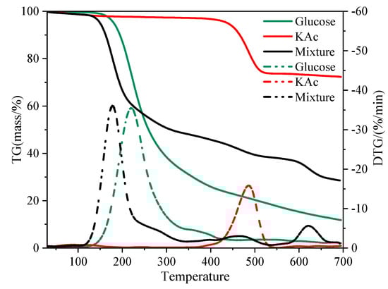 The thermal decomposition of glucose in the absence and presence of a catalyst (KAc, NaAc or K2CO3), respectively, was performed on a thermogravimetric analyzer (TGA, NETZSCH-TG209F1, NETZSCH-Gerätebau GmbH, Waldkraiburg, Germany). The ratio of glucose to catalyst was 1/0.25 (wt/wt). All the sample dosages were 4.0 mg. The program temperature was raised to 700 °C from room temperature at 40 °C/min under an atmosphere of 99.99% nitrogen with a flow of 20 mL/min.
