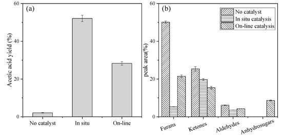 Comparison of the acetic acid (AA) yields (a) and product distributions (b) of the glucose pyrolysis with (both in situ catalysis and on-line catalysis) and without a catalyst at 350 °C for 30 s.