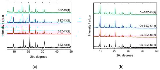 Table 1 presents the prepared materials and their compositions. Briefly, SSZ-13(1) was synthesized hydrothermally by applying TMAdaOH as a structure-directing agent. SSZ-13(2) contains the quantity of TMAdaOH reduced by half compared to the initial synthesis mixture of SSZ-13(1). In the following materials—SSZ-13(3, 4) we varied the sodium hydroxide concentration. The XRD patterns (Figure 1a) of the solid final products—prepared from the studied reaction mixtures hydrothermally treated at 150 °C for a certain period, correspond to the CHA-type materials. No impurity phase was observed. The narrow peaks suggest the high crystallinity degree of the samples. Thus, the changes in the chemical composition of the reaction mixture did not affect the phase composition of the final product. Figure 1b shows the XRD patterns of Cu-exchanged SSZ-13, indicating that the chabazite (CHA) structure was maintained during the ion-exchange. Cu2O and CuO phases at ca. 2θ = 35.29, 36.30, 38.49 and 38.72° [,] are not observed. The relatively low content of copper (4.4–5.2 wt. %) therefore can result in either a high copper dispersion or the amorphous nature of Cu2O and CuO.