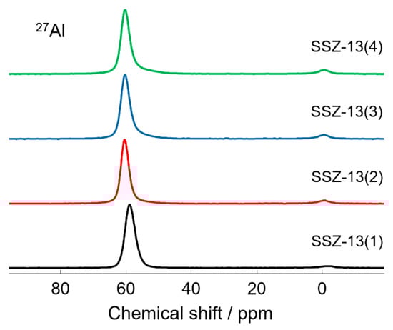 Figure 3 shows the 27Al NMR spectra for the H-SSZ-13 samples. The majority of Al is tetrahedrally coordinated and fully incorporated in the framework, as indicated by the peak at 59 ppm for Cu-SSZ-13(1) and 60 ppm for Cu-SSZ-13(2–4). Although Al is in tetrahedral coordination in zeolite framework, its local environment differs among the samples. However, additional experiments are required to make a more detailed analysis and consequently, precisely designate the Al siting. Those Al4+ in Si(OH)Al units can provide Brønsted acidity. Only a small amount of extra-framework octahedral Al at 0 ppm is noticeable [], indicating that extra-framework Al species are marginally populated at the same time, suggesting that enhanced Lewis acidity that was observed in the IR spectra stems from Cu species.