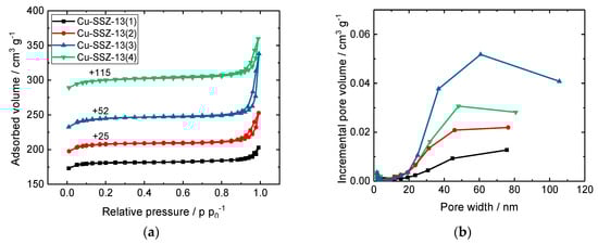 Figure 4a displays the N2 adsorption-desorption isotherms of the studied Cu-SSZ-13 materials. According to the IUPAC classification [], all isotherms of the samples exhibit a mixed Type I and Type IVa isotherm with an H1 type hysteresis loop in the range of p p0−1 > 0.9, indicating the presence of the inter-crystalline meso-/macroporosity. The values of specific micropore volume are similar in all samples and are common for highly crystalline SSZ-13 material (Table 2). A general trend of an increase of the specific surface area and total pore volume in the samples prepared from the systems with a reduced TMAdaOH quantity (Cu-SSZ-13(2–4)) is observed (Table 2) in accordance with the SEM findings on the decreased crystal size (Figure 2).