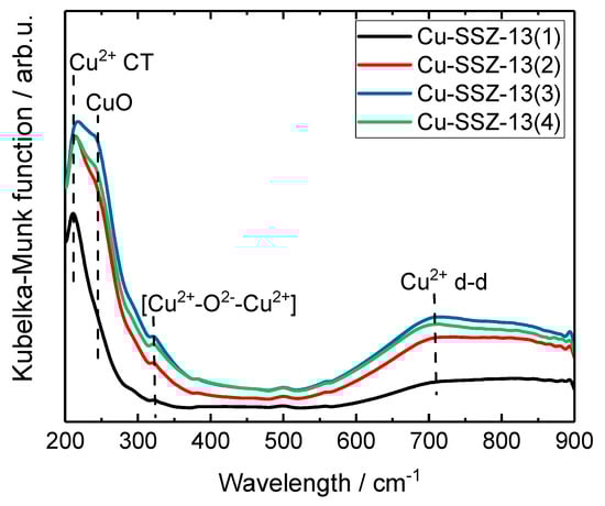 The copper speciation was broadly evaluated by DR UV-Vis, IR and EPR spectroscopy as well as TPR-H2 studies to show evidence for the difference in the properties of the Cu moieties dispersed in zeolites SSZ-13(1–4). Although copper ions were introduced in the form of divalent cations, part of Cu still could undergo reduction during calcination and the presence of Cu+ is definitely supposed. Moreover, both vacuum pretreatment (FT-IR experiments) and He-treatment applied before catalytic tests also provoke partial reduction of Cu2+ species to Cu+. A first insight into the speciation of copper sites can be provided by DR UV-Vis analysis (Figure 5). All investigated materials have two distinct bands in DR UV-Vis spectra. The charge transfer band at around 211–215 nm is related to O → Cu charge transition (CT) from lattice oxygen to isolated Cu+/Cu2+ species stabilized by the zeolite framework [,]. The broad absorption band between 500 and 800 nm is assigned to the d → d transition of Cu2+ [,]. An additional band at around 245 nm in the spectra of Cu-SSZ-13 is attributed to CuO species [], while the band at ca. 325 nm proves the presence of oligomeric Cu2+–O2−–Cu2+ chains []. Based on the DR UV-Vis spectra analysis, it can be concluded that copper species were introduced to the Cu-SSZ-13(2–4) materials in a similar aggregation state. On the contrary, the spectra of Cu-SSZ-13(1) revealed mainly the contribution of monomeric cations stabilized by the chabazite framework in this sample. Similar results were provided by ammonia sorption followed by IR spectroscopy.