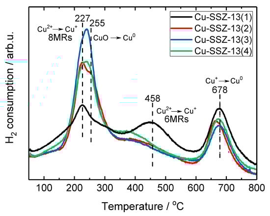 The reducibility of the Cu-SSZ-13 materials was confirmed by the TPR experiments (Figure 6). Although it is difficult to differentiate the nature of copper species located in different sites, the identification of Cu species could be attained by comparing TPR-H2 with the literature data. All the Cu-containing chabazite samples exhibit three-reduction peaks in the temperature range of 50–800 °C. The low-temperature peaks (<350 °C) were assigned to the reduction of isolated Cu2+ in cha cage to Cu+ ions (Cu2+ + ½ H2 → Cu+ + H+) and to the reduction of CuO to Cu0 (Cu2+ + H2 → Cu0 + 2 H+). Namely, the Cu2+ ions located in the pore openings, i.e., inside the cha cages next to eight-membered rings are expected to be more easily accessed by H2. The reduction peak in the range of 350–600 °C is attributed to the reduction of Cu2+ in the six-membered ring to Cu+ (Cu2+ + ½ H2 → Cu+ + H+), while the high-temperature peaks above 600 °C were associated with the reduction of highly stable Cu+ ions to Cu0 (Cu+ + ½ H2 → Cu0 + H+) [,]. The assignment of the dimeric Cu centers, i.e., [Cu-O-Cu]2+ is less intensively investigated in the literature. The reduction of [Cu–O–Cu]2+ also occurs in two stages as isolated monomeric Cu2+ ions []. Moreover, Verma et al. [] claimed that the [Cu–O–Cu]2+ preferred coordination in eight-membered rings. Thus, in our case, such species appear to be reduced below <350 °C. The amount of H2 consumed during TPR-H2 provides qualitative information on the number of reducible Cu ions in the studied samples (Table 2). Verma et al. [] also evaluated the Cu species in Cu-SSZ-13 catalysts with an n(Si)/n(Al) atomic ratio of 4.5 and found that there is a limit for the density (n(Cu)/n(Al) = 0.2) of the isolated Cu2+ at the six-membered rings in SSZ-13. Beyond this limit, a part of the isolated Cu2+ ions converts to Cu dimers. In our case, all Cu-SSZ-13(1–4) materials revealed n(Cu)/n(Al) in the range of 0.72–1.10 which indicates the formation of Cu dimers of oxide nature, in line with DR UV-Vis spectra.