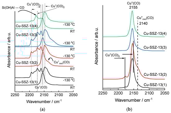 To further elucidate the presence of various copper speciation forms in Cu-SSZ-13(1–4), IR studies of CO sorption were carried out. At room temperature, the CO molecule is able to interact with exchangeable Cu+ to form monocarbonyls (2155 cm−1) or dicarbonyls (2150 and 2178 cm−1) and Cu+ in oxide-like phase (2140 cm−1). Stable carbonyls formed with the participation of Cu2+ ions can be observed only at temperatures as low as −100 °C [,,]. The sorption of CO at −130 °C on the all samples studied reveals the bands (2250–2190 cm−1) originating from Cu2+ carbonyl species in Cu-SSZ-13(2) only (Figure 7a). The monocarbonyl Cu2+oxo(CO) band (ca. 2210 cm−1) is characterized by the very low value of the absorption coefficient. Moreover, the intensity of 2210 cm−1 band can be influenced by neighboring Cu+ carbonyl originated bands. Finally, the amount of Cu2+ species cannot be easily estimated from the low-temperature IR spectrum. Such species are, however, undoubtedly present in the zeolites studied. If they cannot be detected with CO in other catalysts studied, it can be supposed that the electron-acceptor properties of Cu2+oxo species are not sufficiently strong to effectively bond CO molecules.