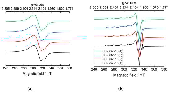 EPR allows identifying the coordination environment of isolated Cu2+ ions because all the other Cu species ([Cu–O–Cu]2+ or Cu+) are EPR silent [,]. Figure 8a shows very similar EPR spectra characterized by a single isotropic peak centered at giso ≈ 2.17, comparable to the one observed for copper in aqueous solutions, in agreement with previous studies []. In the hydrated zeolites (i.e., calcined in the air), the presence of water molecules in the coordination sphere of Cu2+ ions leads to their detachment from the framework. As a result, the EPR spectra show an overlap of isotropic and anisotropic features. The former is due to aqueous complexes, which tend to move towards large cavities of the zeolite where they can freely rotate on the timescale of an EPR experiment: in this case, the hyperfine and g tensors are averaged. The latter comes from Cu ions attached to the framework and, thus, is responsible for the anisotropic components. The relative intensities of the samples were calculated as the double integral of the RT signal and normalized with respect to the weight of each measured sample. The values changed from 6.57 for Cu-SSZ-13(1) to 1.00 for Cu-SSZ-13(2). For Cu-SSZ-13(2) and Cu-SSZ-13(4), the relative intensity reached 1.27 for Cu-SSZ-13(3) and 1.69 for Cu-SSZ-13(4), respectively (Table 3).