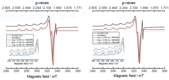 The presence of more than one Cu species can be also deduced from the EPR signals (Figure 8). Upon hydration sphere removal, the isolated Cu2+ species migrate within the extra-framework positions, therefore, the dehydrated samples are enriched in Cu species in comparison with the fresh, hydrated material []. In particular, three different Cu sites (namely A, B and C) were identified by the spectral simulations illustrated in Figure 9 (Table 4 for the spin Hamiltonian parameters). The distribution of the sites is different for the four Cu-SSZ-13 samples (Table 5) and is given by the weight with which the simulations were performed. The EPR parameters of A and B are very similar to the ones found for the Cu-CHA zeolites in earlier studies [,]. They are usually associated with Cu2+ ions strongly bound to the oxygen of the framework in six-membered ring (6MRs) sites with two aluminum atoms that compensate the copper charge.