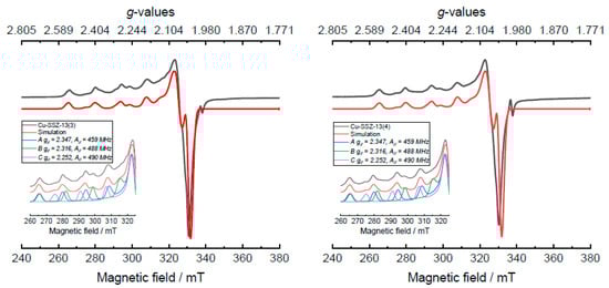 The concentration, structure and coordination environment of isolated Cu2+ ions were investigated using electron paramagnetic resonance spectroscopy (EPR). The EPR spectra were recorded at room temperature with a Bruker EMXmicro X-band spectrometer (Rheinstetten, Germany). The modulation amplitude and the microwave power were kept at 10 G and 2 mW, respectively. The spectra were simulated by using the Easyspin software (version 6.0.0-dev.20) []. An axial spin Hamiltonian model was used for the simulation of each spectrum with a Voigtian line shape and an equal line width for all the species. The EPR spectra were recorded at room temperature for all Cu-SSZ-13 samples also in their dehydrated form.