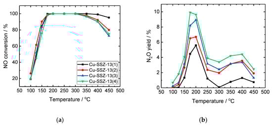 (a) NO conversion and (b) N2O yield during SCR over the Cu-SSZ-13 catalysts (reaction conditions: 0.1 g of catalyst, 60 mL min−1, 500 ppm NO, 575 ppm NH3, 4 Vol. % O2 and He balance, GHSV = 60 000 h−1).