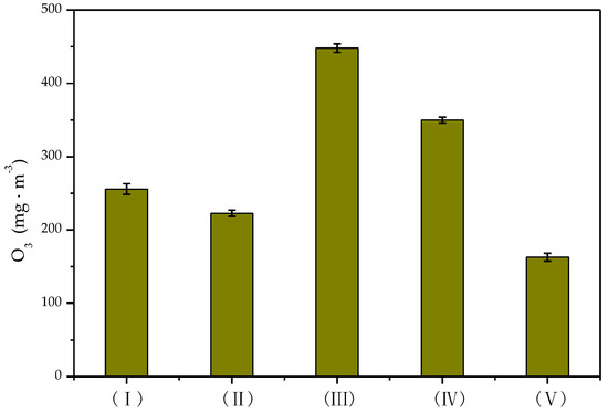 In the process of catalytic degradation of toluene in the nonthermal plasma systems, the mixture of toluene was obtained by purging with air, so the formation of ozone was inevitable. Figure 3 shows that the concentration of ozone generated in the DDBD reactor was significantly higher than that in the DBD reactor. The concentration of ozone was lowest in the reverse-flow DBD-catalyst reactor, at 162.9 mg·m−3, as some of the ozone was decomposed in the later stage of the reaction. In the DDBD reactor, the concentration of O3 increased gradually with the extension of the discharge time, finally reaching 448.4 mg·m−3. At this time, part of the ozone participated in the reaction or thermal decomposition, resulting in a slightly decreased concentration. However, in the DDBD reactor, due to the weak field strength in the discharge area of the outer tube and the low-temperature increase of the system, the ozone concentration was much higher than that in the DBD reactor. When catalyst was added into the reactor, the formation of O3 was inhibited [38] and the concentration of O3 decreased. The catalyst could absorb ozone on its active sites to achieve catalytic degradation of ozone, effectively decreasing the concentration of O3 and ultimately decreasing secondary pollution [39].