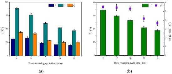 Effect of flow reversing cycle on reverse-flow dielectric barrier discharge (DBD)-catalyst reactor capabilities: (a) changes in T; (b) changes in η and EY.
