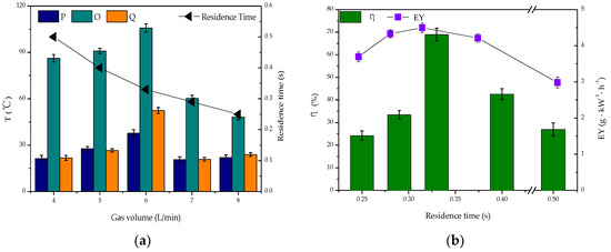 Effect of the residence time on DBD reactor: (a) changes in T; (b) changes in η and EY.