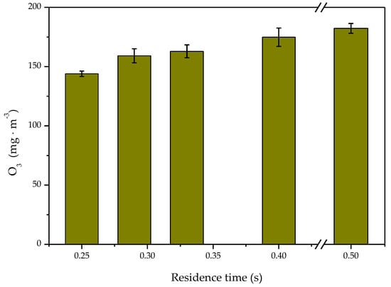 As shown in Figure 7, the maximum concentration of ozone increased gradually as the residence time increased. As the maximum temperature in the reaction system could reach above 100 °C, the ozone participated in toluene degradation and was decomposed by the heat [44]. As the residence time increased, there were more reactions between pollutant molecules and active radicals in the reactor. At the same time, more active oxygen atoms reacted with each other to form ozone, but the increase of ozone generation was slow.