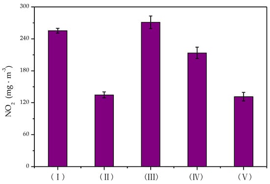 It can be seen from Figure 9 that less NO2 was generated in the DBD reactor (I) than in the DDBD reactor (III). In the DBD reactor, the amount of NO2 production decreased significantly from 255.2 mg·m−3 to 134.7 mg·m−3 after the introduction of the catalyst. When also combined with flow reversing, the amount of NO2 production further decreased by 3.28 mg·m−3. In the DDBD reactor, the amount of NO2 production decreased by 68.5 mg·m−3 after the addition of the catalyst, so it could be inferred that the formation and degradation of NO2 were mainly related to the presence of the catalyst. There was no obvious effect of heat accumulation by the introduction of flow reversing technology.
