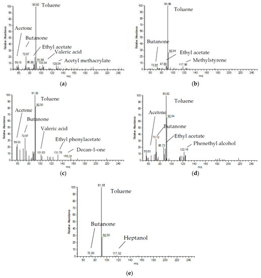 Gas chromatography-mass spectroscopy (GC-MS) results from different reactors. (a) DBD reactor; (b) DBD-catalyst reactor; (c) DDBD reactor; (d) DDBD-catalyst reactor; (e) Reverse-flow DBD-catalyst reactor.