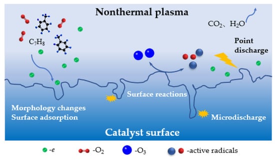 Nonthermal plasma can induce the dielectric heating of the catalyst, thereby improving its apparent catalytic activity [10]. Additionally, the combination of flow reversing increased the system temperature, further increasing catalyst activity. The mechanism of toluene degradation by the DDBD-catalyst reactor was consistent with that of the DBD-catalyst reactor. The key factor in the reaction was the generation of various active substances, such as high-energy electrons, hydroxyl radicals, and oxygen radicals [56]. According to the above results and discussion, the total reaction mechanism for toluene degradation by non-thermal plasma co-catalysis technology is shown in Figure 11 [51].