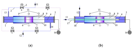 (a) DBD reactor and (b) DDBD reactor. Schematic diagram of reaction device: 1. quartz tube; 2. gas pipeline; 3. solenoid valve; 4. high voltage; 5. insulating plug; 6. grounding pole; 7. discharge area (catalyst section); 8. heat storage section; 9. regenerator; 10. insulating cotton; 11. main air inlet; 12. main air outlet; 13. reactor inlet (outlet); 14. reactor outlet (inlet); 15. thermocouple temperature measuring position; 16. power supply; 17. inner tube of DDBD reactor; 18. outer tube of DDBD reactor.