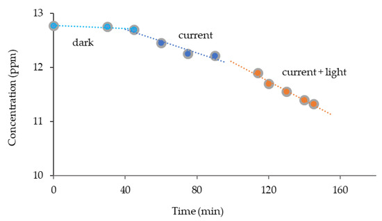 The photo-electrocatalytic activity of the samples was firstly tested by a preliminary run performed in a beaker cell, in the dark, at open circuit for the first 60 min; after that, galvanostatic conditions were imposed (1.25 mA, 1 h), and finally, the light of the xenon lamp was switched on. The electro- and photo-electroactivity of the sample is clearly shown from the increase of about 60% in the slope of the trend with time of the reactant concentration (Figure 1), recorded during this test.