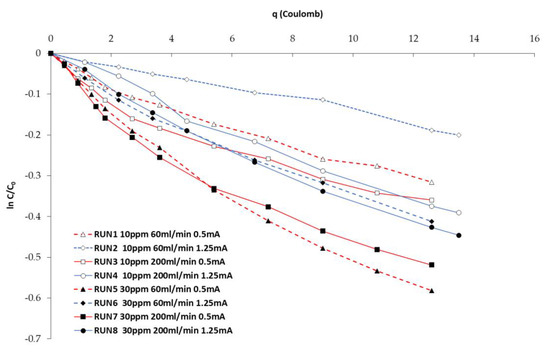 Trend of logarithm of DRN concentration, normalized with respect to its initial concentration, as a function of the electric charge supplied during the galvanostatic electrolyses performed at the irradiated samples, under the different conditions planned in the Design of Experiment (DoE).