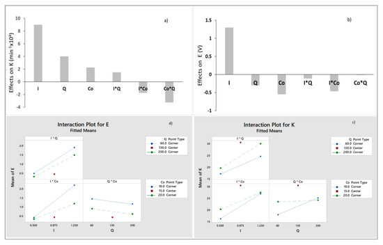 In the present case, the attention was paid on the evaluation of the possible factors which could be important to determine the final performances. Thus, single and combined effects of the different parameters were evaluated by Equation (2), and compared in Figure 4a,b for K and E, respectively. We can observe that I has the highest single and positive effect on both the functions (the higher the applied current, the higher K and E are measured).