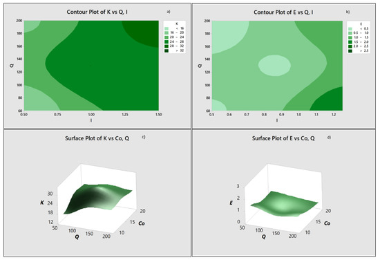 Contour plots and surface plots of K (panel (a,c)) and E (panel (b,d)), respectively. (I, Q, C0 stand for applied current, electrolyte flow rate and initial concentration, respectively).
