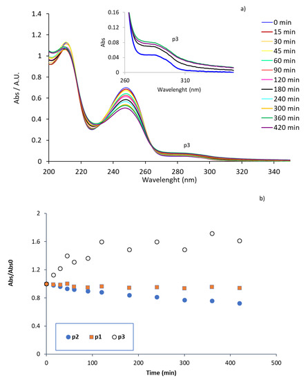 Trend with time of the spectra of absorbance (panel a) and the height of the peaks (panel b) p1, p2 and p3, normalized with respect to their initial values obtained for I = 0.5 mA, Q = 60 mL min−1 and C0 = 10 ppm.