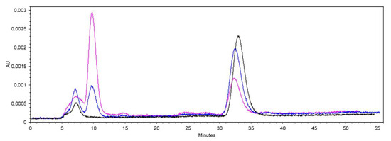 Example of the trend of the HPLC spectra measured at 280 nm, at different times of reaction: t = 0 (black curve), t = 60 min (blue curve), and t = 300 min (pink curve).