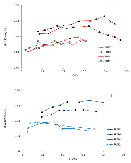Values of absorbances detected at 280 nm as a function of the removal of DRN obtained for the eight runs: panel (a) reports the results at I = 0.5 mA; panel (b) reports the results at I = 1.25 mA.