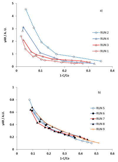 Figure 10a,b resume the same data, expressed in terms of yield (yAR), evaluated as ratio of absorbance values, related to AR produced over DRN removed, and grouped according to the two levels of C0. The results of the RUN 9 at 2.5 mA have also been displayed in Figure 10b, having been obtained at a high level of C0.