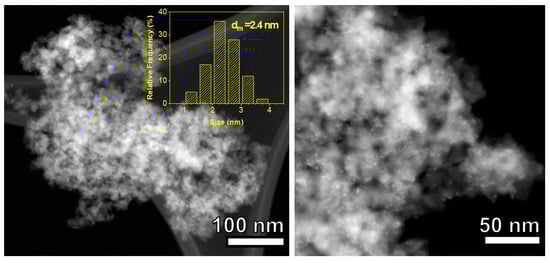 Scanning transmission electron microscopy (STEM) analysis confirmed the presence of small (mean size diameter 2.4 nm) well-shaped and highly dispersed Cu nanoparticles (Figure 1). STEM images allowed us to highlight the nanoparticles, which are brighter in the images, and distinguish them from the amorphous SiO2 support.