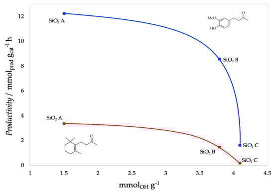 This aspect has also been investigated by measuring the surface contact angle for the three silicas using propandiol drops instead of conventional water in order to elucidate the differences among silicas. As shown in Figure 4, the higher the contact angle, the higher the productivity obtained, confirming the trend observed with TGA measurements reported in Figure 3. Thus, the contact angle value increases with hydrophobicity, while the −OH density decreases. Data reported in Figure 3 and Figure 4 are therefore consistent in showing that productivity improves when using a more hydrophobic silica as the catalyst support. The more pronounced differences observed in the case of vanyllilacetone bearing an −OH group could be ascribed to the easier desorption of the product from the surface, thus speeding up the reaction, or generally to the presence of the aromatic group that is known to establish interactions with silanol groups via hydrogen bonding [42]. All these aspects could contribute to competition phenomena.