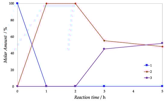 As clearly shown in Figure 5, the hydrogenation of the carbonyl group is also possible under the conditions used. However, the reaction proceeds in two well-separated steps, thus allowing the easy recovery of the pure desired product. An induction period of 1 h can be observed between the two hydrogenation steps. An explanation to this phenomenon could be found in the amount of time needed by the keto-enolic tautomerism to shift towards the enolic form.