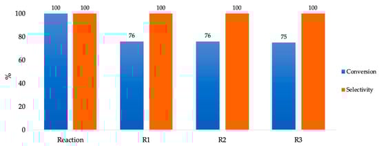 Moreover, Cu/SiO2 A catalyst can be recycled without being pretreated four times, observing only a slight decrease in conversion while keeping selectivity unchanged in all the tests performed (Figure 6). The catalysts were simply separated from the reaction mixture and dried under nitrogen without any pre-treatment before each recycle step. This could justify the slight decrease in the activity of the catalyst, probably due to a pale poisoning and partial deactivation of the active sites. On the other hand, ICP (Inductively Coupled Plasma) analysis does not show any copper leaching taking place after the hydrogenation reaction, thus allowing us to exclude the effect of a lower copper content in the system.