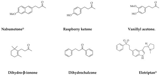 - Bandarenko, M.; Kovalenko, V. Synthesis of raspberry and ginger ketones by nickel boride-catalyzed hydrogenation of 4-arylbut-3-en-2-ones. Zeitschrift fur Naturforsch. Sect. B J. Chem. Sci. 2014, 69, 885–888. [Google Scholar] [CrossRef]