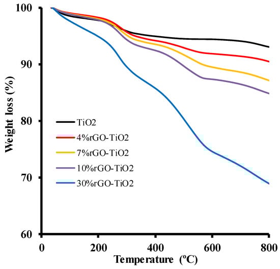 Figure 1 depicts thermogravimetric analysis curves for TiO2 and composite materials obtained in air atmosphere up to a temperature of 800 °C, showing four mass loss regions. The curves reveal an initial mass loss from 35 to 200 °C, corresponding to dehydration and related to the elimination of adsorbed water molecules from the surface; the second loss, between 200 and 325 °C, corresponds to the decomposition of labile oxygenated groups bound to GO sheets; the third loss, between 325 and 600 °C, corresponds to the combustion of carbon and more stable oxygenated groups [37,41]; and the fourth, between 600 and 800 °C, corresponds to the dehydroxylation process. The rGO (%) content of composites was calculated by subtracting the mass loss of TiO2 alone from the mass loss of rGO-TiO2, obtaining 3.7% for 4% rGO-TiO2, 6.9% for 7% rGO-TiO2, 9.4% for 10% rGO-TiO2, and 28.3% for 30% rGO-TiO2.