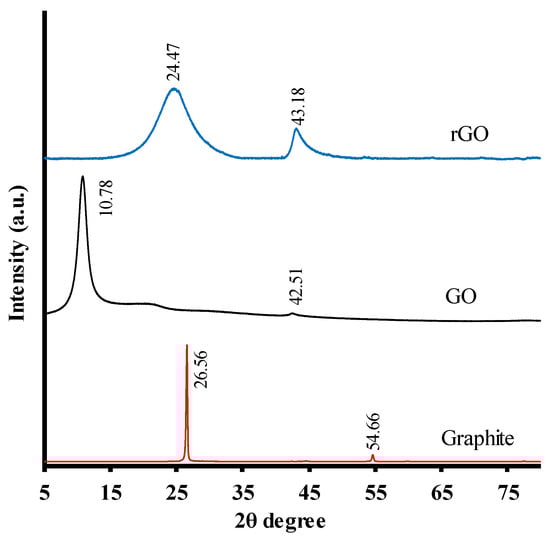 Figure 2 depicts the diffractograms for graphite, GO, and rGO. Graphite shows a pronounced diffraction peak centered at 2θ = 26.56°, corresponding to the (002) plane and indicating a high degree of crystallinity, with an interplanar distance of 0.336 nm (obtained by applying Bragg’s law). Graphite peaks were identified using the JCPDS file n° 75-1621.
