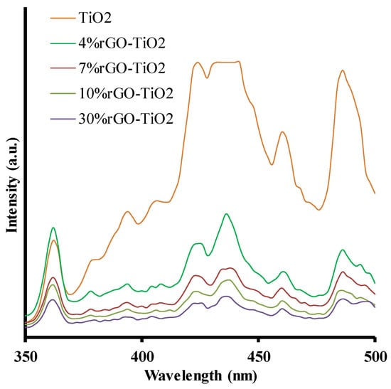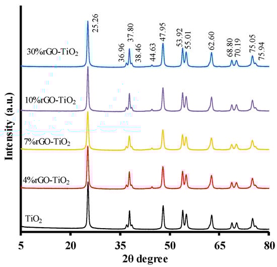 We observed no peaks of rGO in any rGO-TiO2 samples (Figure 3), possibly due to their low percentages of rGO, so that they are masked by the diffraction signal for TiO2, and/or to destruction of the regular stack of GO through the intercalation of TiO2 during sample preparation [38,39,41,43,44,48,49]. In comparison to GO (Figure 2), the complete disappearance of the peak at 10.78° in all composites suggests the successful conversion of GO to rGO in the final composites [39,50].