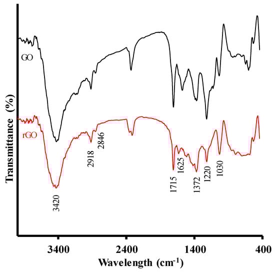Infrared spectroscopy provides information on chemical composites and their structures through the molecular vibrations associated with each band. Figure 4 depicts the FTIR spectra for GO and rGO. Graphite shows no significant peaks (spectrum not shown). GO shows numerous peaks or bands of oxygenated groups [42].