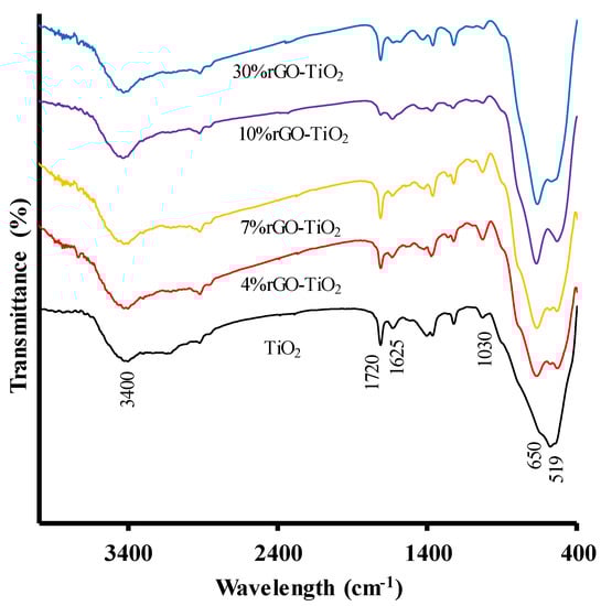 Figure 5 displays the IR spectra of rGO-TiO2 composites. In TiO2, the strong and wide band at 3400 cm−1 corresponds to stretching vibration of hydrogen bound to surface water molecules and hydroxyl groups. This is confirmed by the presence of a peak at 1625 cm−1 caused by bending vibration of coordinated water and Ti–OH groups [57,59]. This peak is also assigned to vibration of the aromatic ring in the GO structure within the composites. The reduced intensity of the peak in the composites at 1720 cm−1 suggests that they largely contain hydroxyl groups rather than ketone or carboxylic groups [58]. The reduction in the peak at 1030 cm−1 corresponds to oxygenated functional groups such as C–O [42].