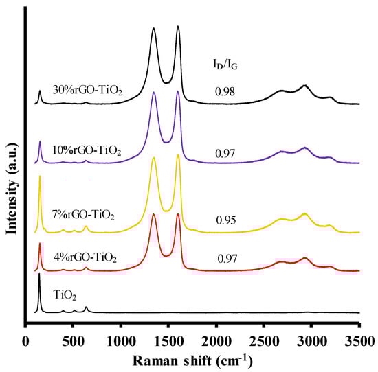 The increase in ID/IG ratio intensities from GO, rGO, to rGO-TiO2 indicates a decrease in the mean number of sp2 domains formed during the hydrothermal reaction. The increased ID/IG ratio in composite spectra also confirms the formation of rGO-TiO2 composites by the hydrothermal treatment [39,67,68]. The ID/IG ratio is 20–24% higher in the composites than in GO, and the smallest increase is in the 7% rGO-TiO2 sample.