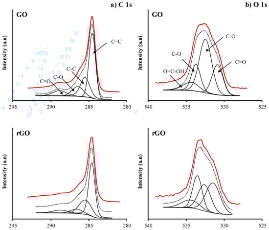 XPS profiles of GO and rGO: (a) C 1s spectra and (b) O 1s spectra. Continuous red line: experimental profile; discontinuous black line: fitted profile.