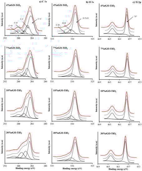 The partial reduction of GO is confirmed by calculating the ratio of peak areas for oxidized carbon to peak areas for completely reduced carbon atoms, AC-O/AC-C. Thus, the AC-O/AC-C ratio is lower in all rGO/TiO2 composite materials than in the original GO, being 0.28 for the GO sample, 0.17 for rGO, 0.18 for 4% rGO/TiO2, 0.19 for 7% rGO/TiO2, 0.21 for 10% rGO/TiO2, and 0.23 for 30% rGO/TiO2 (Table 7).