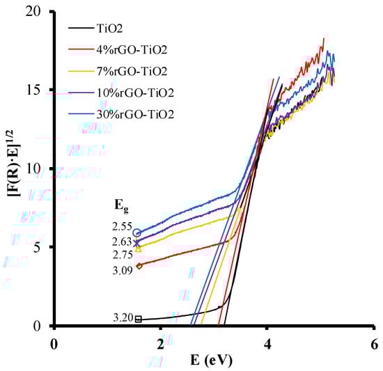 The spectra of TiO2 and composites show peaks at 650 and 519 cm−1, attributed to vibration of Ti-O-Ti bonds in TiO2 [25,42,57,59]. Generally, broadbands or peaks below 1000 cm−1 in composites indicate a combination of Ti–O–Ti and Ti–O–C vibrations due to the chemical interaction of TiO2 with rGO [54]. The presence of Ti–O–C bonds indicates that GO, with residual carboxyl groups, strongly interacts with the surface hydroxyl groups of TiO2 nanoparticles and forms chemical bonds in the composites during hydrothermal treatment.