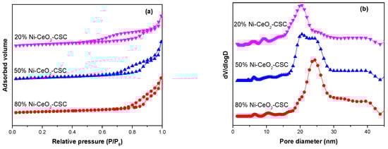 (a) N2 adsorption–desorption isotherms and (b) pore size distributions of the fresh Ni-CeO2-CSC catalysts.